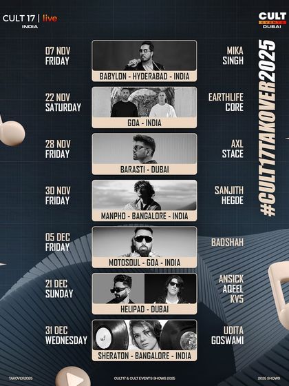 We’re CULT 17. Started with a wild idea, honestly - not just music, but a movement. We wanted to make nights you remember, not just gigs. From India to Dubai, we hunt for the right spaces, perfect sound, and those moments when the crowd and artist just click. Like when Sanjith Hegde said, 'ee talent annu naanu nodidaga... I was blown' (when I saw this talent... I was blown). That’s the stuff we live for. Rain, speakers, Goa, Bangalore - all for the Cult wanderers. One night. One vibe.
