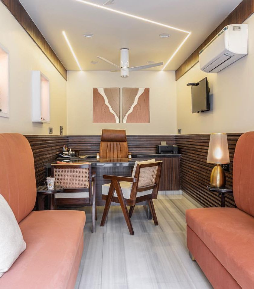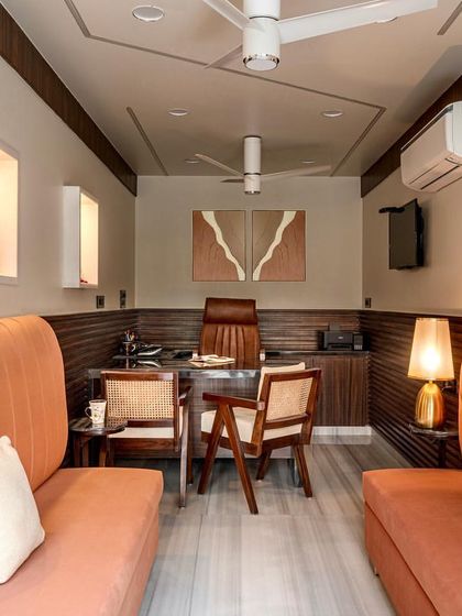 I transformed this narrow 162 sq. ft. space for a property dealer into a functional office with a contemporary vintage theme. The design features smart space-saving solutions like booth seating and integrated storage, all wrapped in a warm, earthy color palette.