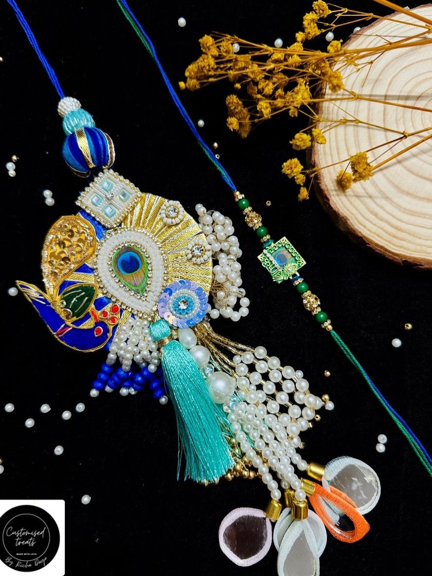 Celebrate their special connection with my coordinated Rakhi sets. This collection features everything from traditional Lumba rakhis for your Bhabhi, adorned with pearls and tassels, to modern sets with matching evil eye or peacock feather motifs.