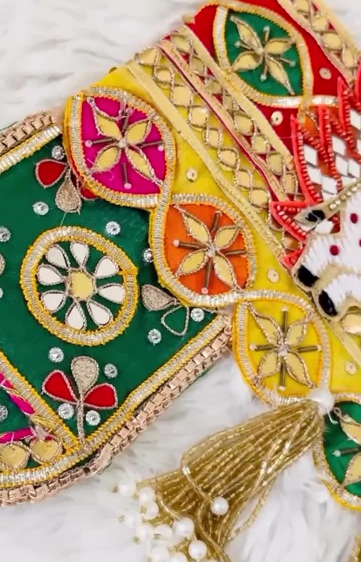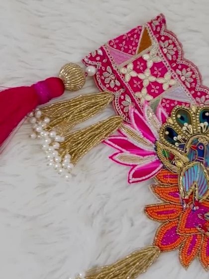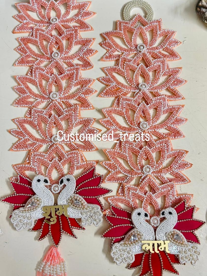 Invite good fortune and positive vibes with my collection of Shubh Labh hangings. Each pair is handcrafted with materials like velvet, beads, and mirrors, featuring diverse designs from parrot and peacock motifs to elegant florals, perfect for your main door or pooja space.