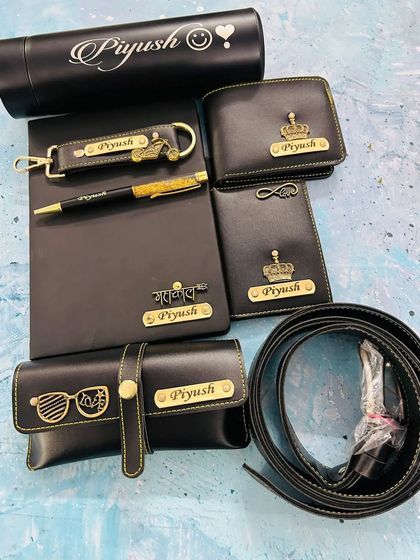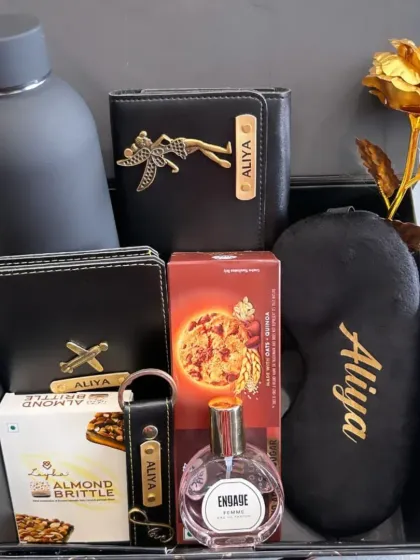 Surprise her with a thoughtful, personalized gift set. I create beautiful hampers featuring items like clutches, jewelry boxes, and passport holders, often in coordinated color themes like all-red or all-black, complete with name engravings and charms.