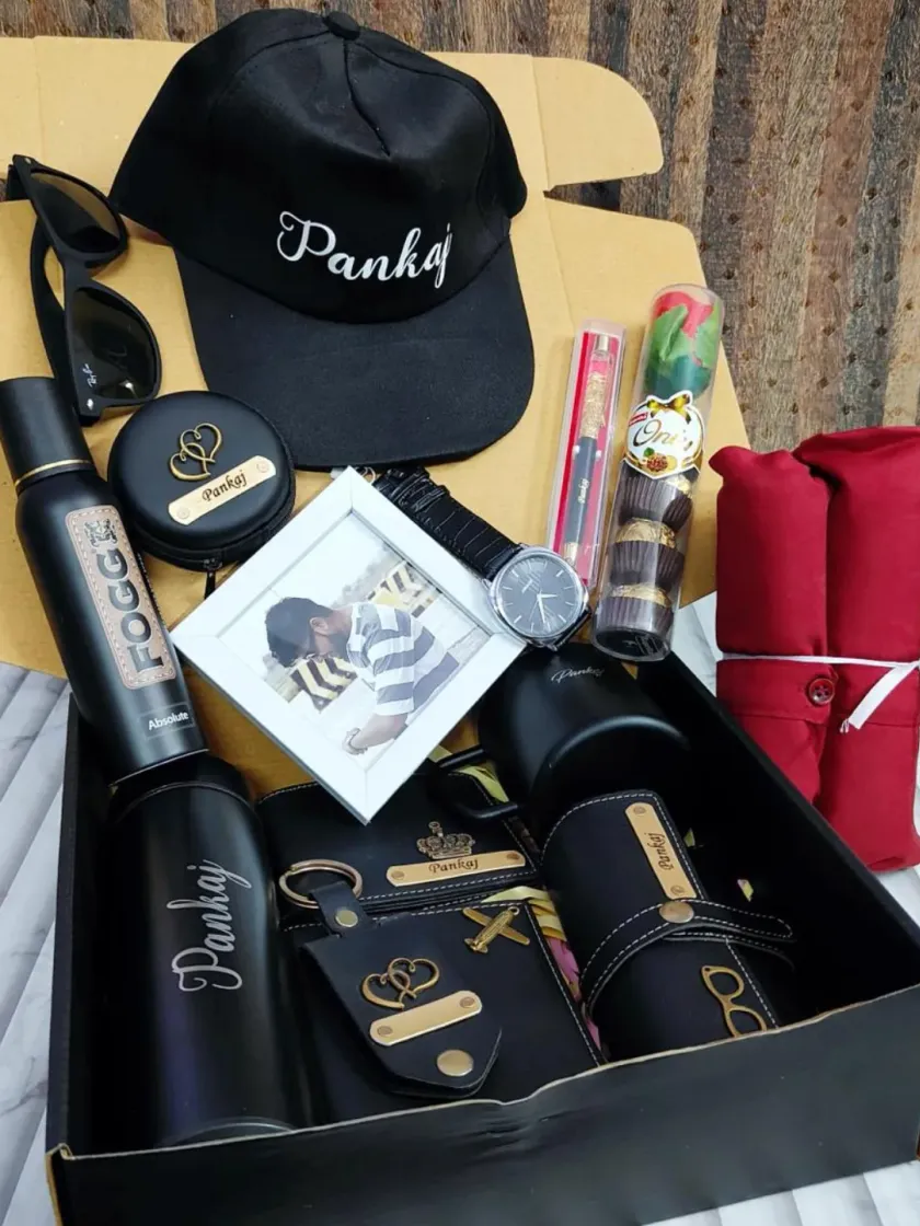 Find the perfect gift with my curated hampers for men. I combine practical items like vegan leather wallets, belts, and pens with personal touches like name engravings, custom charms, and even perfumes, all packed in a stylish gift box.