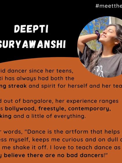 I swear, I was grooving before I could even walk straight! My childhood pics prove it – tiny Deepti in full-on dance mode. Dance is my way of shaking off stress and celebrating the good stuff. If I’m not teaching, you’ll catch me road-tripping with my besties or making silly reels somewhere random. Dogs, adventure, my girl gang – that’s my vibe. But honestly, watching someone with ‘do pair left’ (two left feet) light up after nailing a step? Best feeling ever.