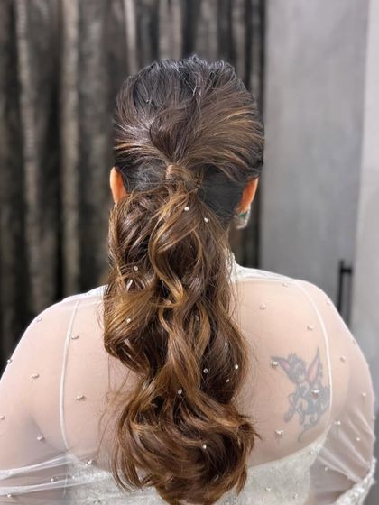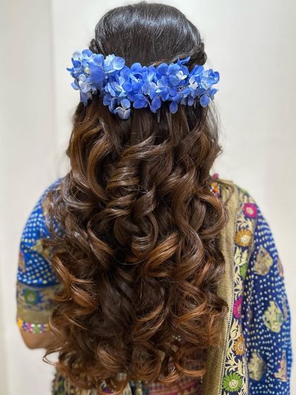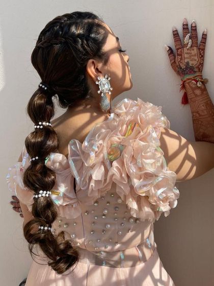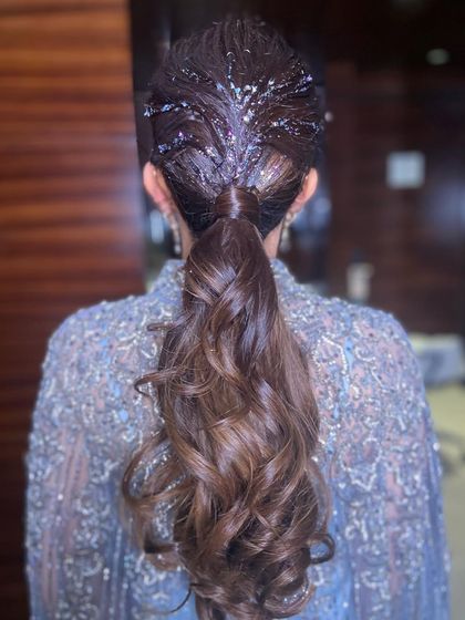 - Sangeet & Mehendi: Playful styles work best. I like doing intricate braids with a dash of glitter, balloon ponytails that move with you, or soft waves with fresh flowers tucked in.
