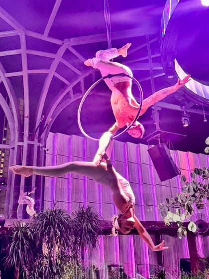 I can go solo for a big impact, or bring in a fellow artist for duo aerial choreography. Duo acts feel like a real partnership - trust, timing, and a lot of fun. We mix it up on hoop, straps, and more.