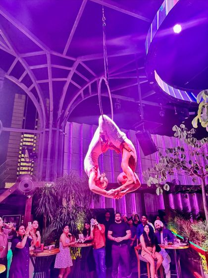 A duo act brings a special energy, built on trust and precise timing. I collaborate with fellow artists to create synchronized choreography on the aerial hoop, straps, and other apparatuses for a high-impact show.