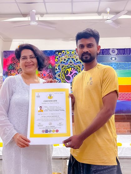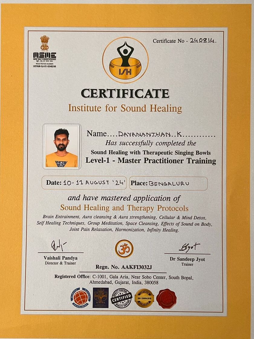 My path into sound healing is a personal one, guided by my teachers, my family, and a deep sense of purpose. I am a certified Master Sound Practitioner, having completed intensive training in the science and ancient wisdom of sound vibrational healing.