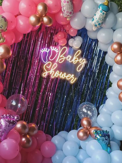 For baby showers, I use pastel balloons, 'Oh Baby' signs, teddy props. Annaprashan and welcome baby events mix modern balloons with marigold flowers.