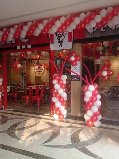 Grand balloon arches and ribbon setups for shop/office openings. For temple events, I use floral, lights, and theme items as per tradition.