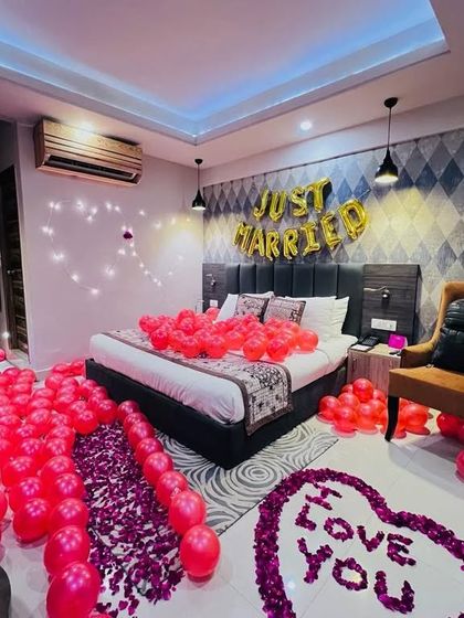 Want to surprise your partner? I do room makeovers with canopy tents, fairy lights, rose petals, heart balloons, and 'LOVE' foil. For parties, I add neon anniversary signs, milestone numbers, and heart-shaped arches.