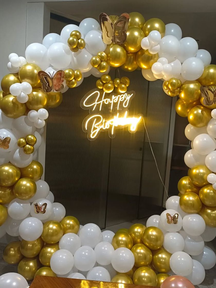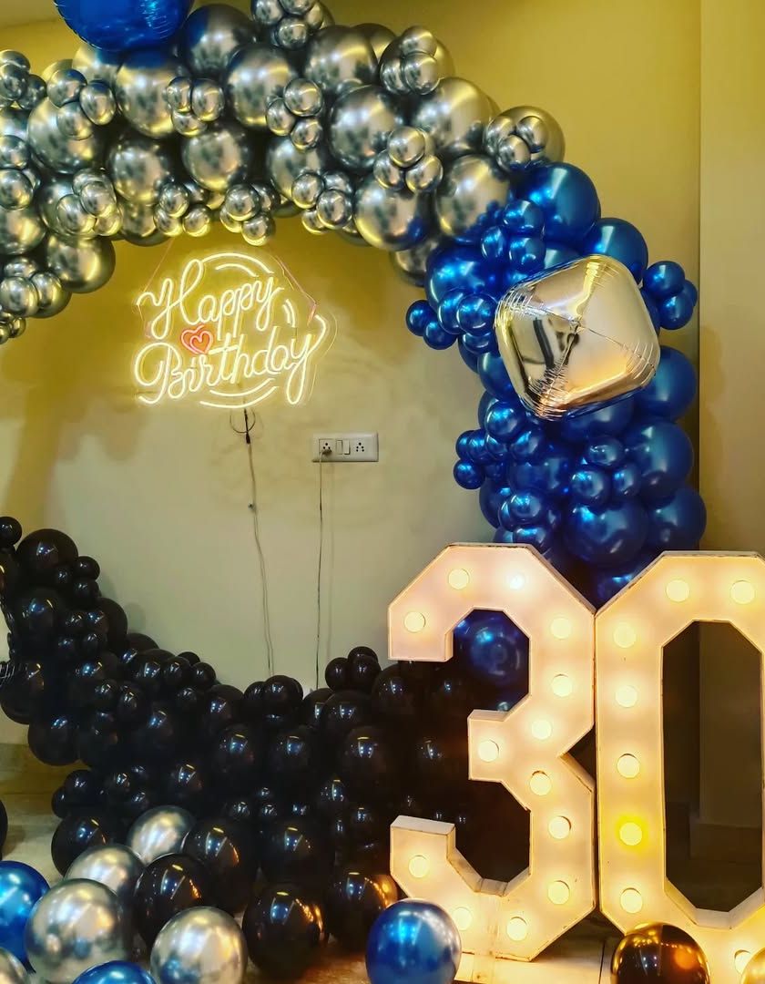 Aajkal ring decoration ka bahut trend hai. Hum alag alag color combinations aur style mein balloon ring aur arch banate hain, jaise gold-white, pastel colors, ya multi-color. Iske saath neon sign aur marquee light numbers lagwane se party ka look hi badal jaata hai.
