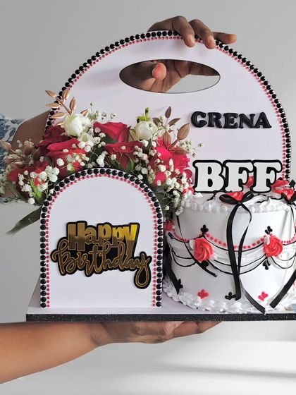 - Layout: Partitioned design securely holding the cake box on one side and the floral arrangement on the other.