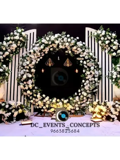 - Structure: Circular ring frame (6ft-8ft dia) or Rectangular Shimmer Wall (Sequin panels in Gold/Silver/Black).