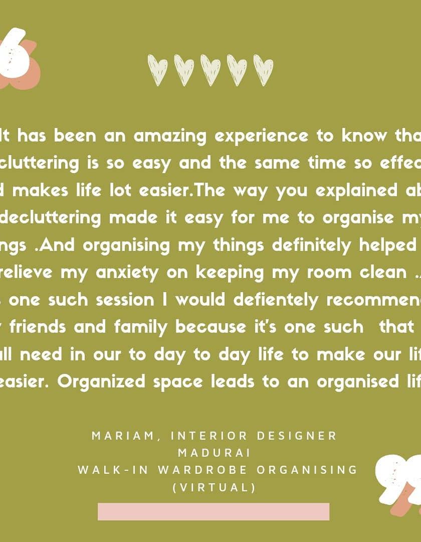 Nothing makes me happier than seeing my clients feel relieved and joyful in their newly organized spaces. Here is what some of them have to say about their experience, from virtual sessions in Thrissur to hands-on projects in Bangalore.