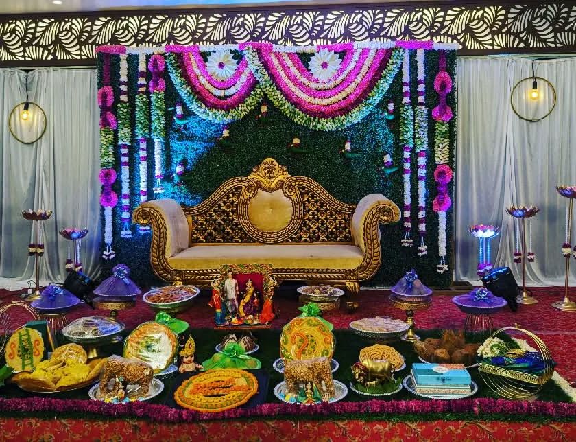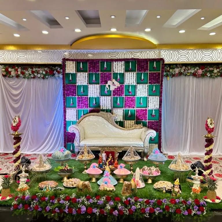 We create beautiful, traditional setups for Seemantham ceremonies that honor your customs. Our service includes everything from floral backdrops and ornate seating to the complete arrangement of symbolic items and thamboolam plates.