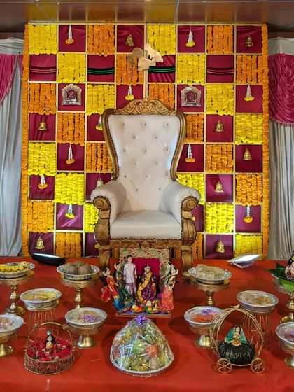 We specialize in decorations for sacred South Indian ceremonies like Seemantham, Naming Ceremonies (Namakarana), and Half Saree functions. Our services include floral backdrops using marigolds and roses, banana leaf arrangements, elegant mandaps, cradle decoration, and detailed ceremonial plate arrangements.