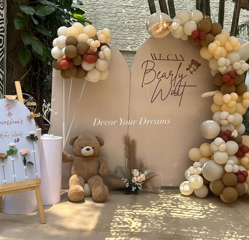 Celebrate the upcoming arrival with our custom baby shower and baby welcome decorations. We offer a range of styles, from classic pink and blue balloon themes and "gender reveal" setups to modern "We Can Bearly Wait" teddy bear themes.