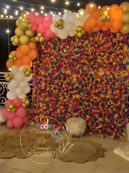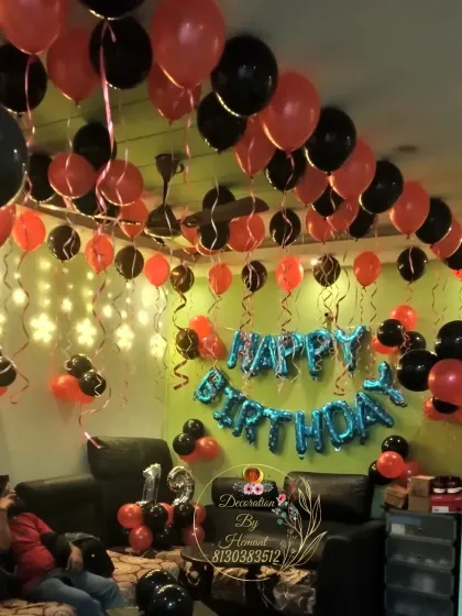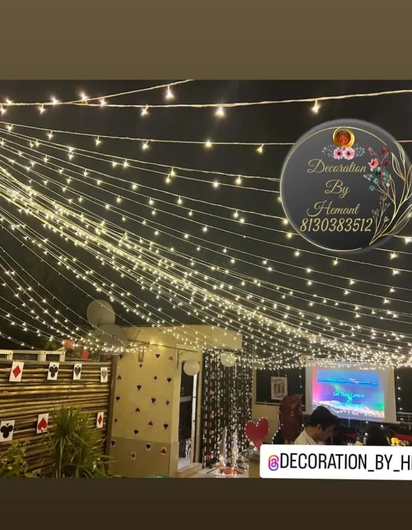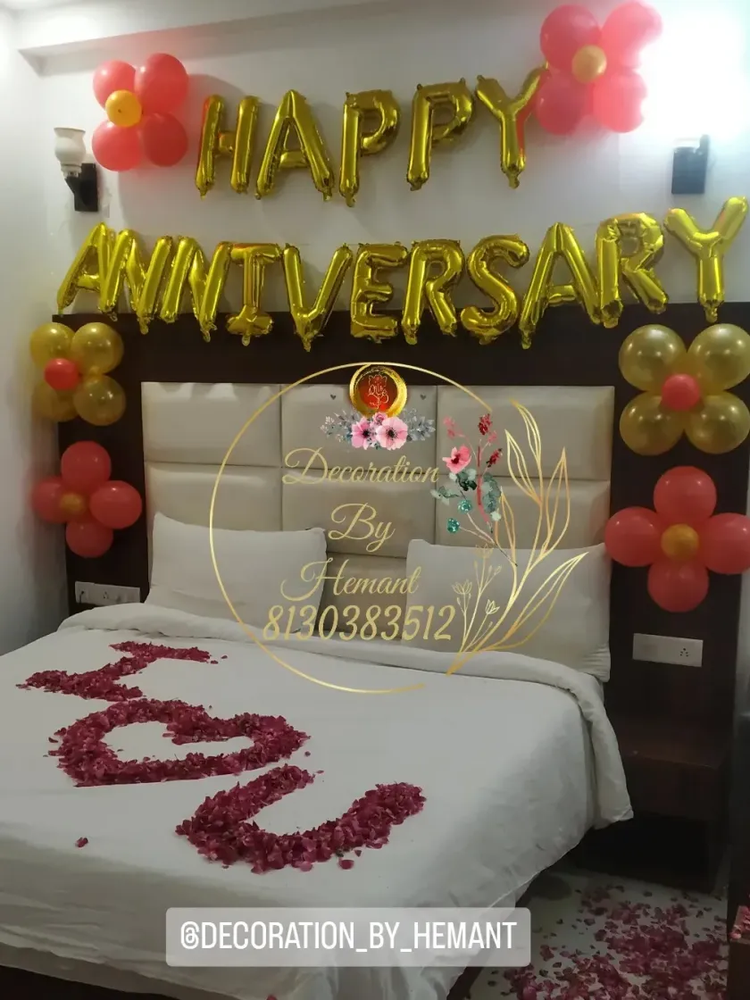 You don't need a big hall to have a beautiful celebration. I can transform any room in your home, whether it's a living room or bedroom, into a festive space for a birthday or anniversary. These setups often include balloon canopies, bed decorations with flower petals, and compact photo backdrops.
