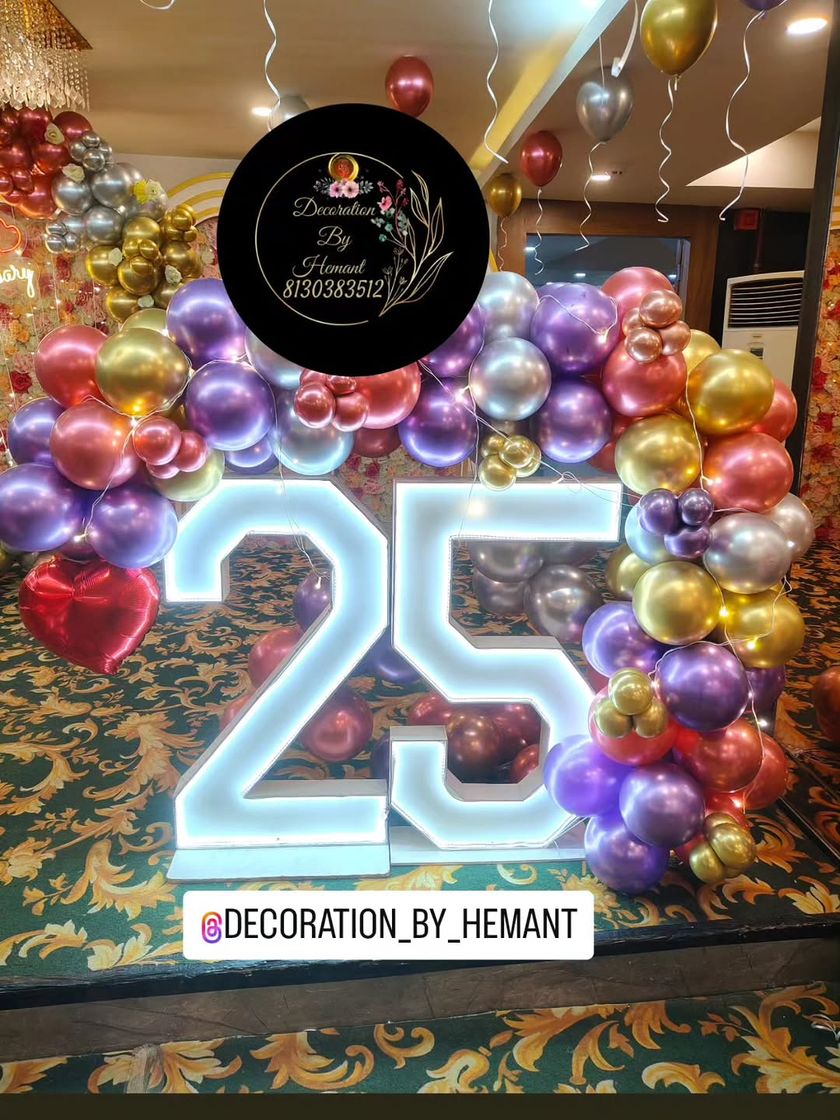 I design elegant decorations for your most important milestones, whether it's a 1st anniversary or a grand 25th, a 40th birthday, or a 64th. Setups can include custom marquee numbers, neon signs, floral arrangements, and sophisticated balloon color palettes to match the importance of the day.