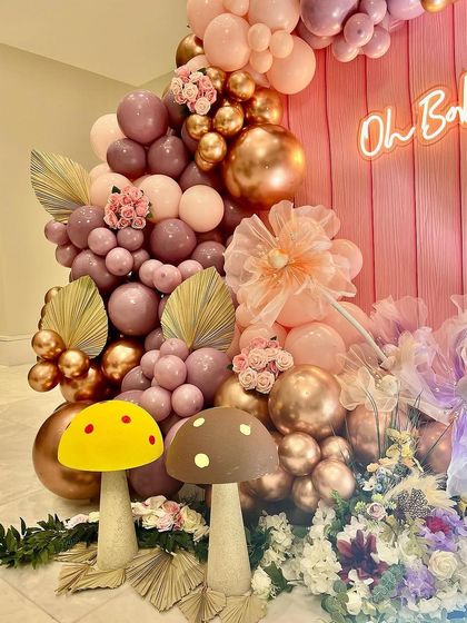 Let's bring a fairytale to life with magical themes perfect for welcoming a little one. I use whimsical props like butterflies and mushrooms, soft florals, and balloon colors like mauve, pink, and rose gold to create an enchanted atmosphere.