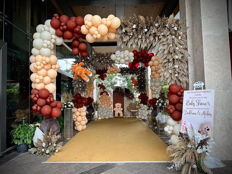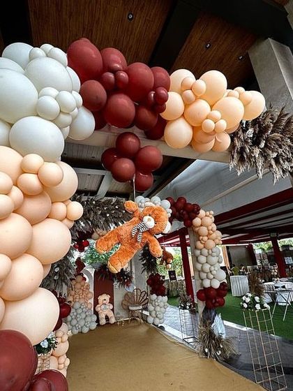 I create warm and stylish celebrations using earthy balloon palettes like brown, cream, and peach. These setups often include natural elements like dried pampas grass and cute teddy bears for a cozy, rustic vibe.
