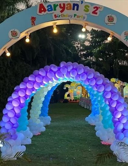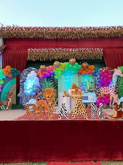 Balloons toh basic hai, lekin balloon arch setup, sequin walls, neon signage, artificial grass walls, personalized boards - pura scene change kar dete hain. Life-size cutouts, 3D props, cake stands, sab ready hai. For kids, magicians, tattoo artists, ya cartoon character appearance bhi arrange karwa sakte hain.