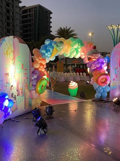 For those who love bright and cheerful celebrations, I design themes like Candyland, Ice Cream Parlor, and Rainbow parties. These setups are filled with vibrant colors, fun props like giant lollipops and ice cream cones, and imaginative balloon art.