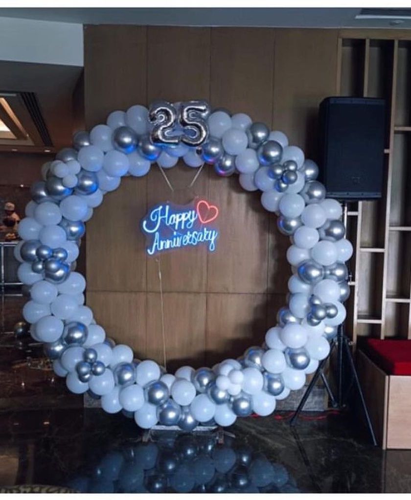 Celebrate your milestones, from your first year to your 25th and beyond. I design custom anniversary decor including elegant balloon rings, floral arches, and personalized neon signs that reflect your journey together.