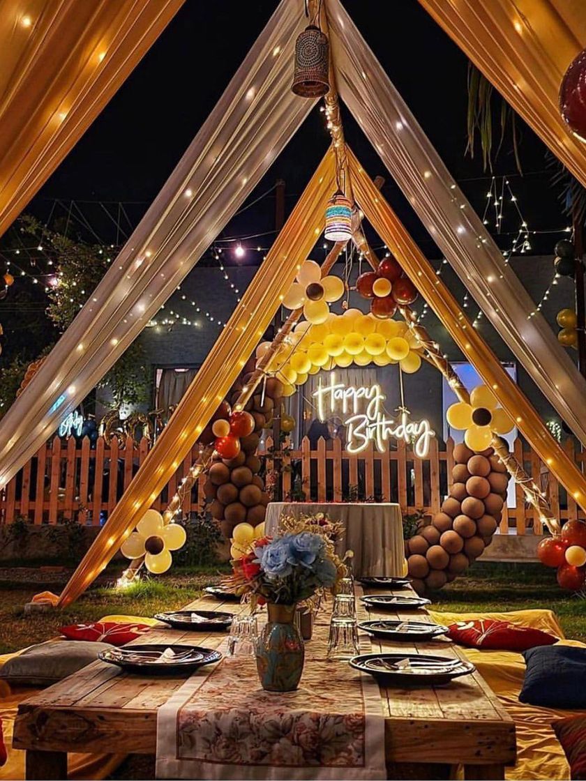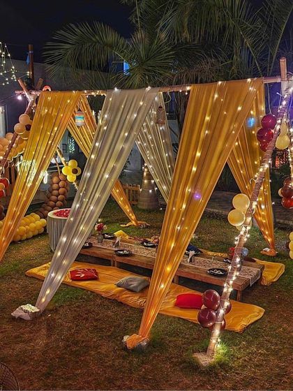 For couples who prefer a private celebration, I transform any terrace, garden, or even a living room into a cozy paradise. These setups feature low seating with cushions, beautiful drapes, and magical fairy lights for a romantic dinner or a small gathering.