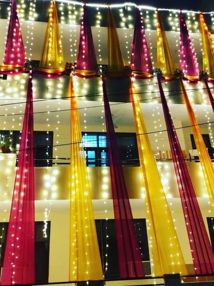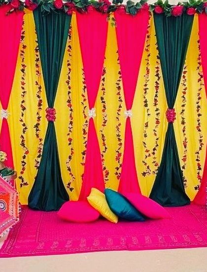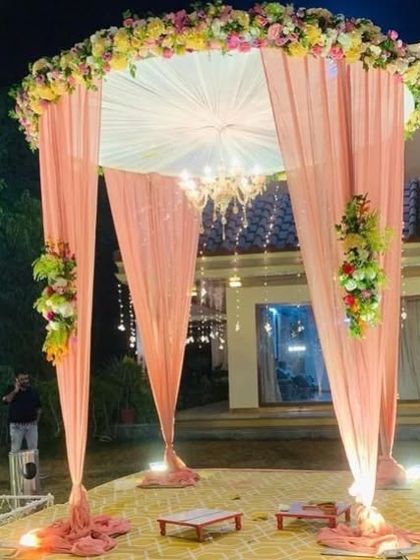 I decorate wedding and pre-wedding venues with custom drapes, flowers, and props, skipping tents for colourful, photo-ready spaces across Delhi NCR and nearby cities.