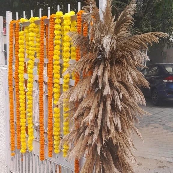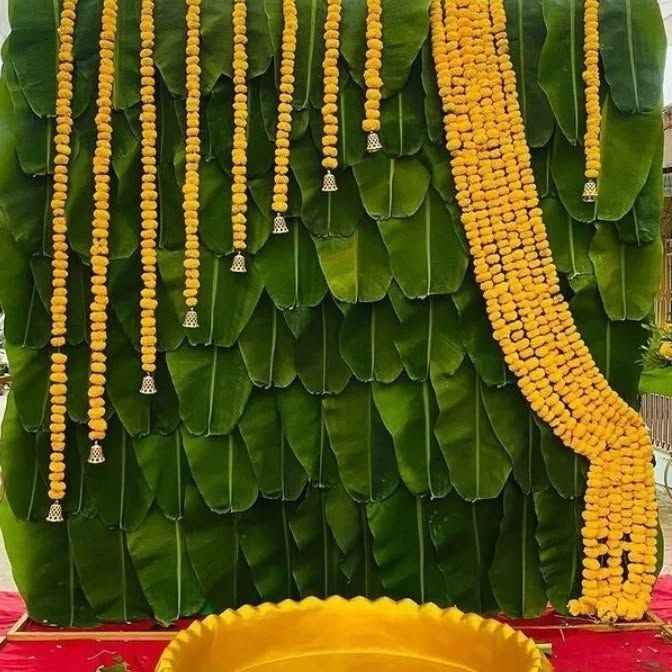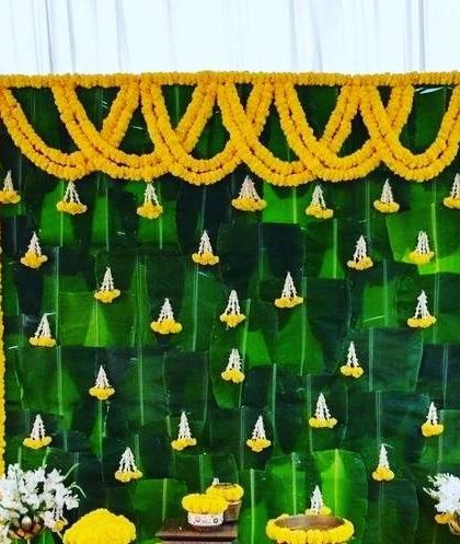 For a fresh and natural look, we create stunning backdrops using eco-friendly materials like banana leaves. These are decorated with traditional marigold garlands and other flowers for a unique and organic feel.