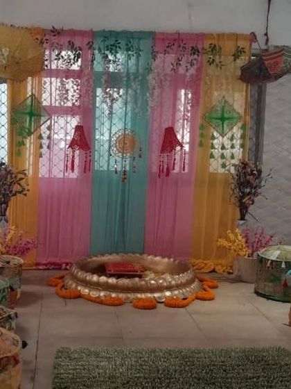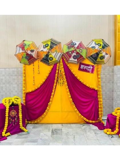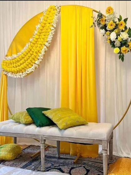 We provide classic and modern Haldi ceremony backdrops, customized for your space. Our designs feature traditional marigold flowers, vibrant yellow fabric draping, and custom "Haldi" signage to create the perfect festive setting.