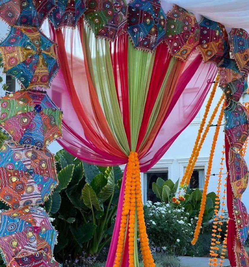 Our Mehendi and Sangeet decorations use a rich palette of colors including pinks, greens, and oranges. We create beautiful backdrops with multi-colored fabric, floral arrangements, and traditional elements for a lively celebration.