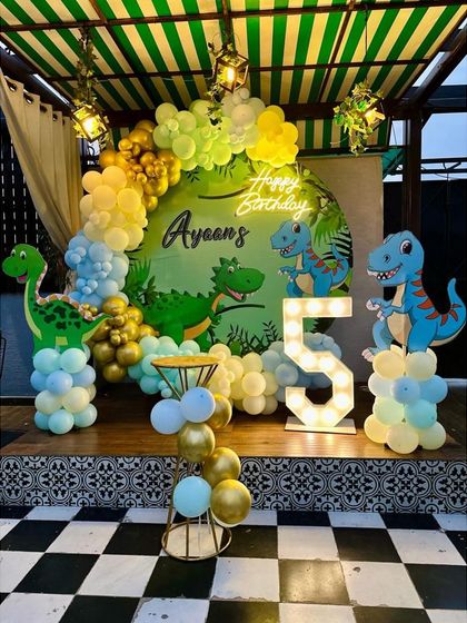 Let's go on a wild adventure! My jungle and safari themes are a big hit, filled with animal props, lush green and earthy balloon colors, and fun details like 'Welcome to the Jungle' signs. I can create anything from a cute animal party to a full-blown jungle safari experience.