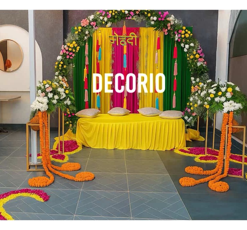 I create vibrant and traditional decor for your pre-wedding functions. My services include everything from classic marigold backdrops and colorful drapes for mehndi to complete Haldi setups with seating and traditional props like charpais.