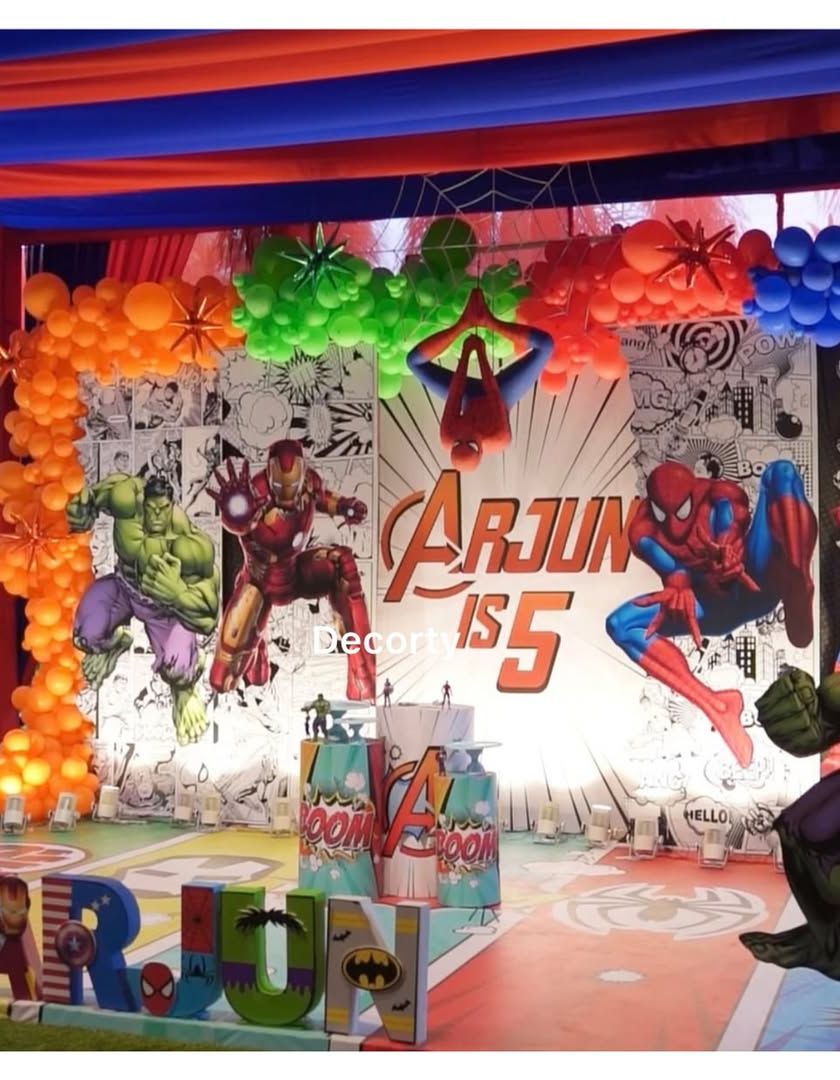 I assemble the ultimate superhero party with themes like the Avengers and Spider-Man. The setup includes dynamic backdrops with cityscapes, life-sized character cutouts, themed table settings, and even an action-ready bouncy castle.