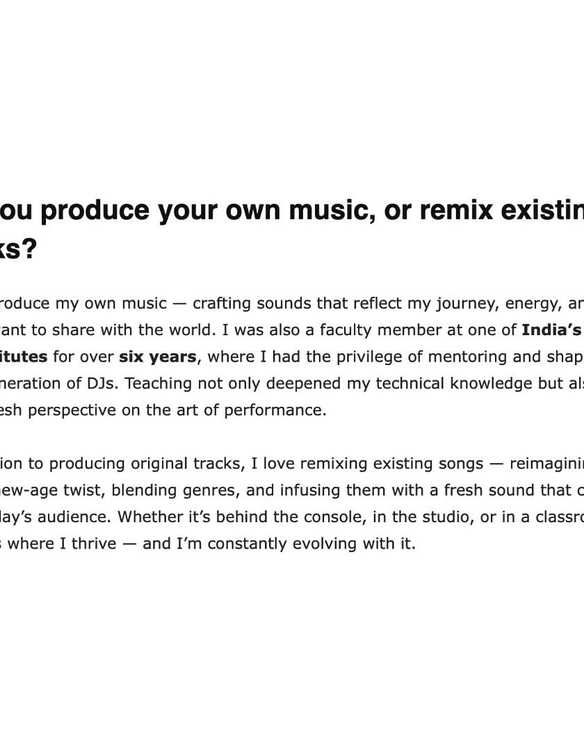 I am the visionary curator behind Womaniya, India's one and only all-girls DJ-based band. We are all about creating space for female talent in the music industry and bringing high-energy, unforgettable performances to every stage.