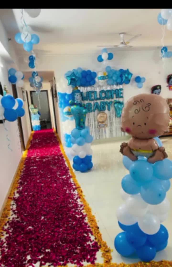 I create complete at-home setups to welcome your newborn. This includes balloon arrangements in themes like blue for boys, a photo backdrop, and an optional flower pathway for a grand entrance.
