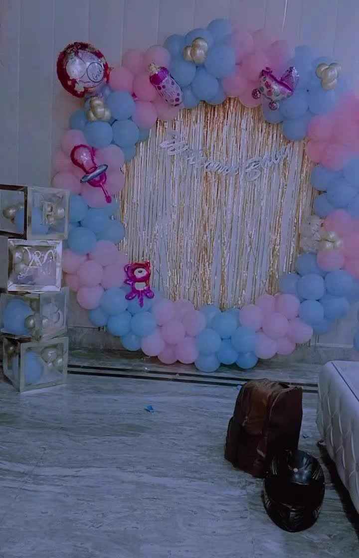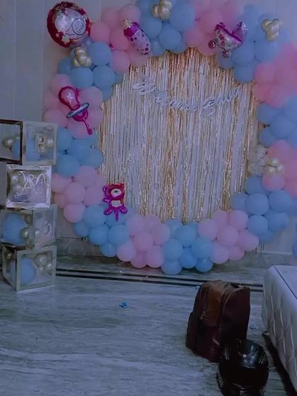 I design fun backdrops for your gender reveal or baby shower party. Popular options include pink and blue balloon arches and transparent 'BABY' boxes for great photos.
