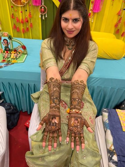 I specialize in creating elaborate and personalized bridal mehndi designs incorporating traditional Indian motifs like peacocks, elephants, and floral patterns. Each design is customized with personal elements like portraits, names, and meaningful symbols that tell the couple's story.