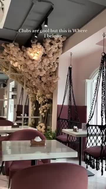 We wanted to create a spot where you could feel at home, a hidden gem that's modern, cozy, and a bit dreamy. Come sink into our pink velvet chairs, relax on the macrame swings, and enjoy the ambiance under our cherry blossom tree.