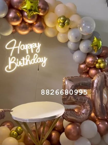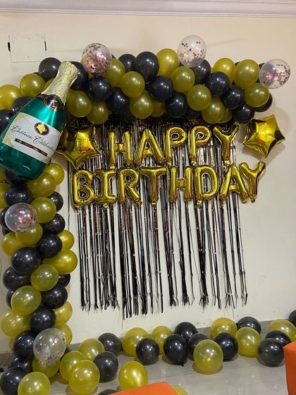 I design stylish and elegant decorations for adult milestone birthdays like the 25th, 30th, or 50th. Setups can feature sophisticated color palettes like black and gold or rose gold, complete with large marquee numbers, champagne bottle balloons, and custom backdrops for a memorable celebration.