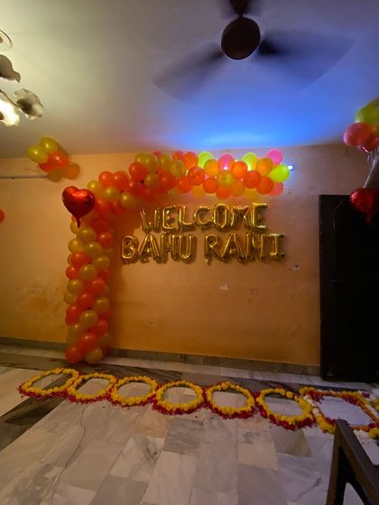 I arrange traditional and modern welcome decorations for newly married couples. This service includes setting up balloon arches with custom messages and preparing the traditional 'griha pravesh' pathway with flowers and other elements.