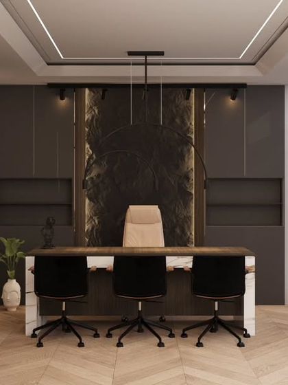 - Feature Walls: PVC UV Marble Sheets (faux marble look) with Charcoal Louvers for reception or MD cabins.