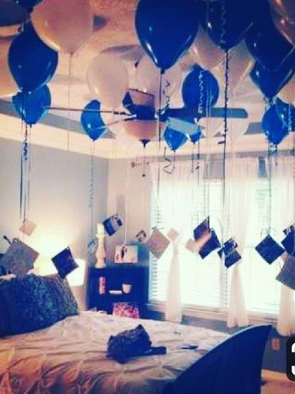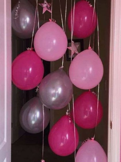- Room filled with balloons, especially welcome baby home balloon setup with helium ribbons.