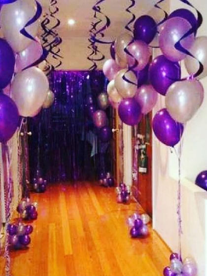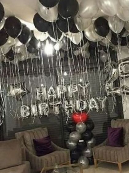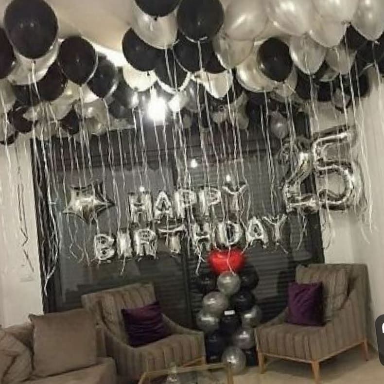 I transform any room into a festive party zone for birthdays. My service includes everything from classic 'Happy Birthday' foil banners and milestone age numbers to full ceiling balloon coverage in your choice of colors, like elegant gold and black, modern silver, or vibrant multi-color themes.
