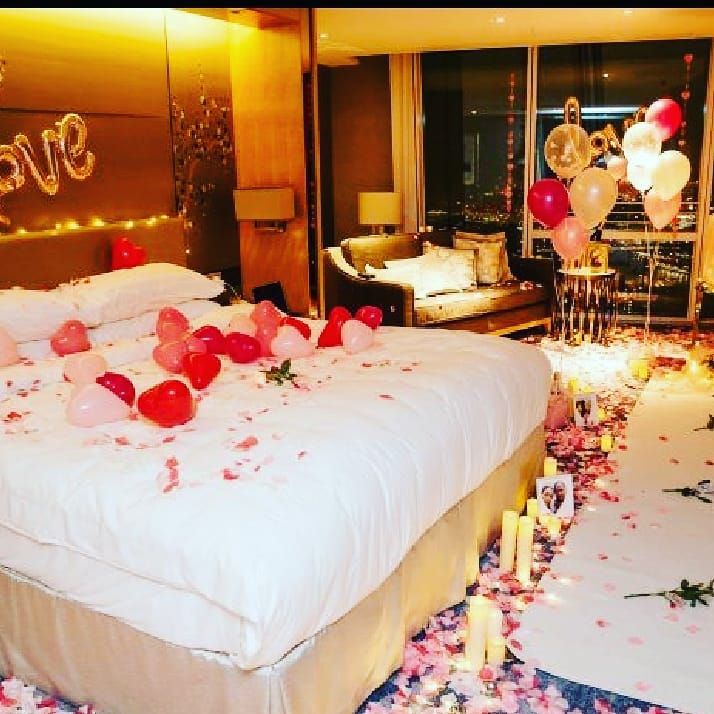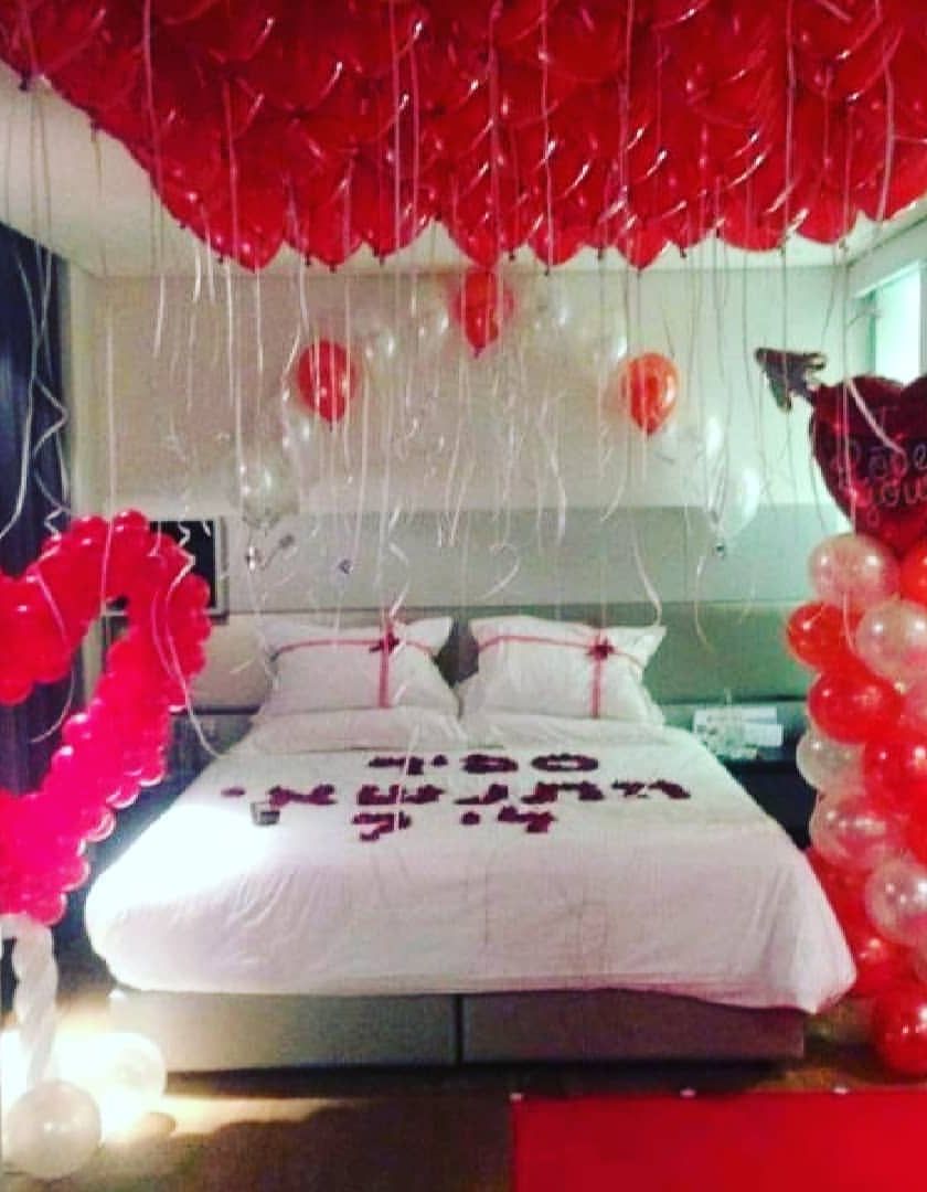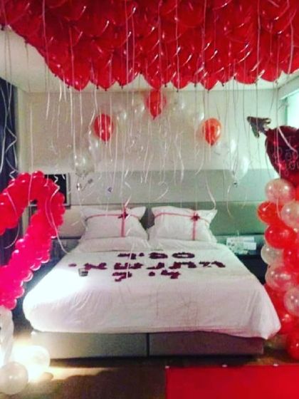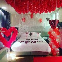 I create intimate and romantic atmospheres perfect for anniversaries, Valentine's Day, or just a special surprise for your partner. These setups often feature red and black or soft pastel color palettes, with elements like heart-shaped balloons, rose petals, candles, and fairy lights to set a magical mood.