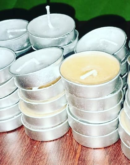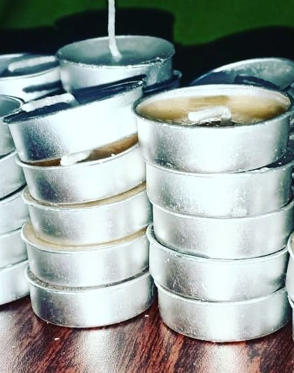 We craft small, round handmade tealight candles perfect for creating ambient lighting at events and spaces. Each tealight burns for 1.5-2 hours, making them ideal for extended celebrations.