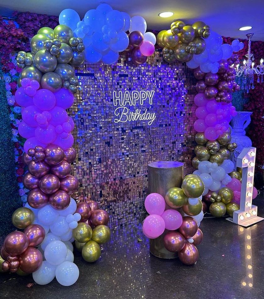 If you prefer a stylish and modern look, I create sophisticated decor using shimmer walls, neon signs, and elegant color combinations like black and gold or rich jewel tones. These are perfect for creating a glamorous photo corner at any event.