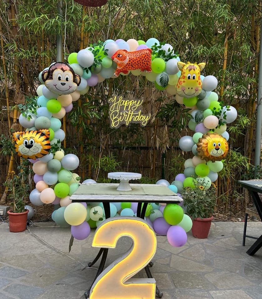 Let's go on an adventure with a wild jungle or safari theme party. These setups feature animal cutouts, green foliage walls, and balloon arrangements in earthy tones to create an immersive experience for your little explorer.